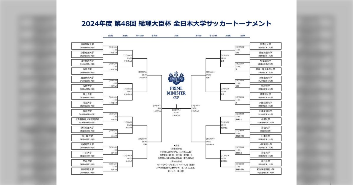 2024年度の「第48回 総理大臣杯・全日本大学サッカートーナメント」の出場校や結果を速報でお届けしていきます! 全国の代表校が夏の大学日本一を目指し熱戦を繰りひろげます!今年の予選を突破した出場校はどんな顔ぶれとなるのでしょうか?!